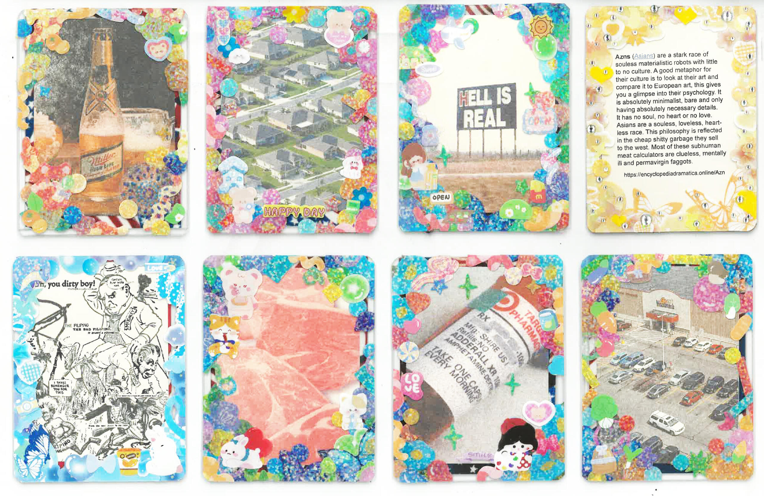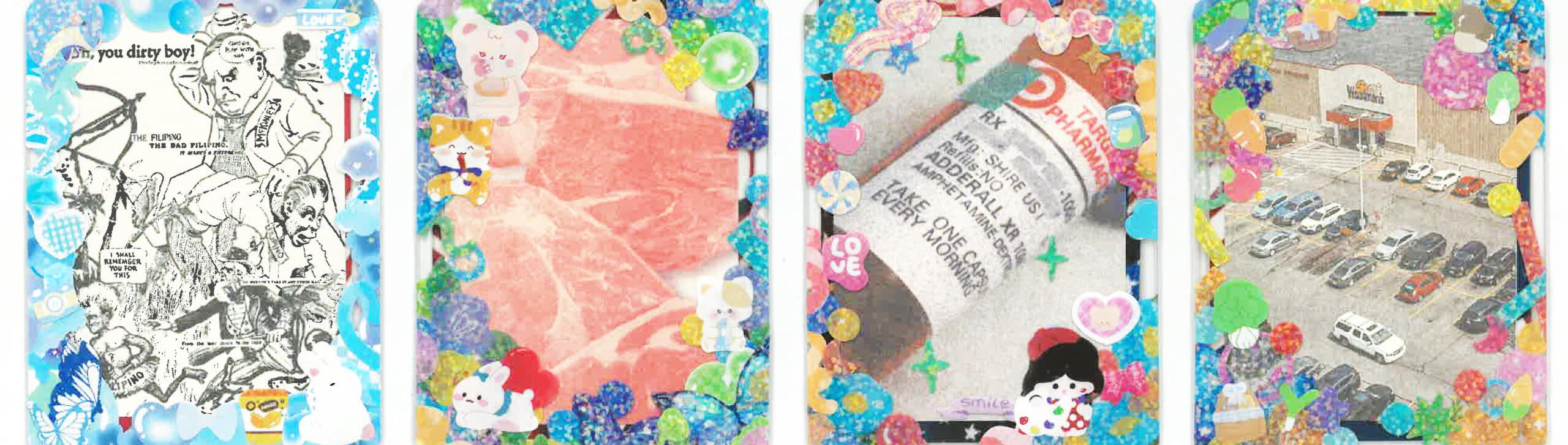 Citrasolv prints, toploader sleeves, holographic stickers, rhinestones, dimensional magic