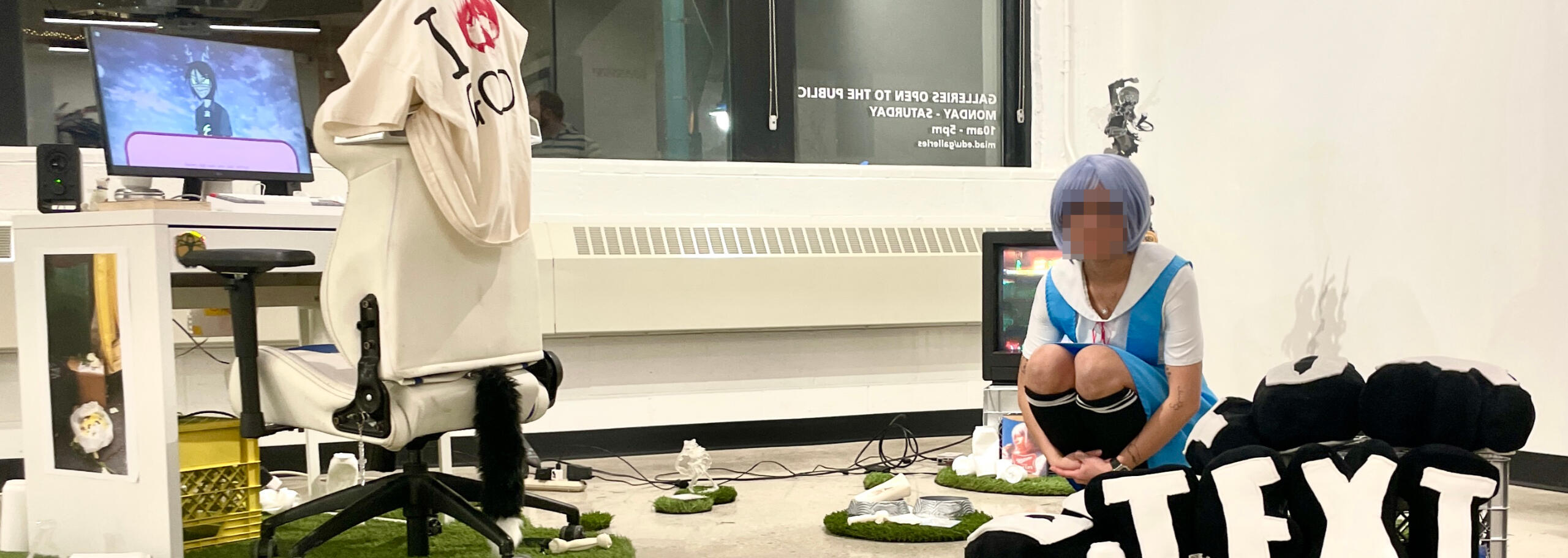 The space I hold as a queer, Filipino-American is an affront and perversion to the tenets of patriarchy and capitalism in Western society. The dissonant feelings which arise from my lived experience drive me to the absurd comforts of the other, the alien, the machine, and the synthetic in my feverish escape from reality into the digital. I choose to incubate my works digitally, letting them ferment in blue light and the documented oral history of the Internet, before manifesting it in the physical world, where it was never meant to exist, but chooses to against all odds.It is in this pursuit of comfort and desperate consumption that I create work. In BOTTOM TEXT, I force static, memetic text to become a soft sculpture meant to be held. In my video and photographic work like WELCOME TO THE HIGH LIFE and I GOT WASHED UP AT THE GREAT MICHIGAN SEA?!, I embody different anime characters both pre-existing and imagined to reject my own personhood and renounce my human body. Through digital fabrication methods like laser-cutting or 3D printing, I kowtow and lap at all things unreal. In WILL YOU PERISH LIKE A DOG?, it is a dog bone in a bowl etched with the image of an anime girl—in GRAVEN IMAGES, it is the sexual paraphilia of otaku and weeaboos synthesized with the words of Genesis. Despite my good judgement, I will choose the arms of a fictional character, as shown in my erotic writing and dating sim THE ONE MY HEART LOVES. I will happily bequeath myself underneath the trash that comes with consumption as seen in my senior thesis installation, TOUCHING GRASS. All the while, I’ll have my genitalia squashed between the gears of a machine, as seen through my BEWARE EROTIC MACHINERY series, where I create my own suggestive signage through machine embroidering and screenprinting.My work is an invitation to reflect and pause upon the human compulsion to ingest falsehoods and idolatry, and to share my strange inclinations and deep affections in a world that does not welcome it.In 2023, I opened up my personal store, ASTRA OASIS, an online rest stop inspired by the rest stops found along the I-94 in Illinois. It serves beings across the Internet on their weary travels in cyberspace who choose to adorn their bodies with various goods and trinkets.